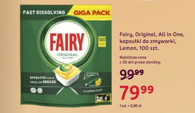 W promocji znalazły się także zawieszki do WC w nowej żelowej formule, która pozwala na 20 % więcej spłukań. BREF Brilliant Gel All in 1 kosztuje teraz 15,99 zł zamiast 22,99 zł. Na rabat można liczyć również w przypadku kapsułek do zmywarki. Opakowanie liczące 100 sztuk od FAIRY Original All In One jest przecenione z 99,99 zł na 79,99 zł. Płynna formuła kapsułki rozpuszcza się o znacznie szybciej, niż zwykła tabletka, dzięki temu szybciej zaczyna działać. Kapsułki nie trzeba rozpakowywać — wystarczy umieścić ją w dozowniku detergentu.